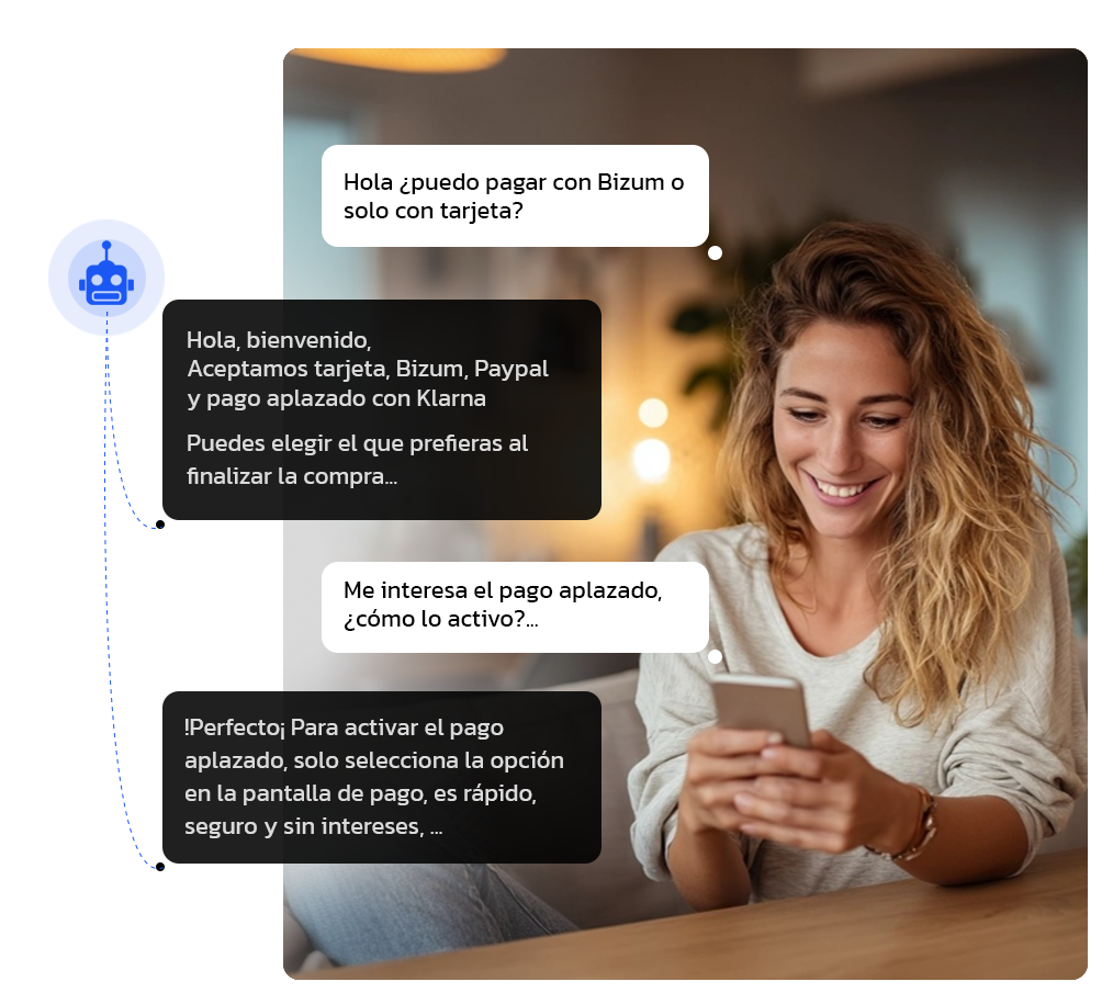 Tu asistente virtual responde al instante sobre disponibilidad, tallas, colores o funcionalidades del producto. Acompaña al cliente durante su decisión de compra y elimina barreras con respuestas útiles en el momento justo.